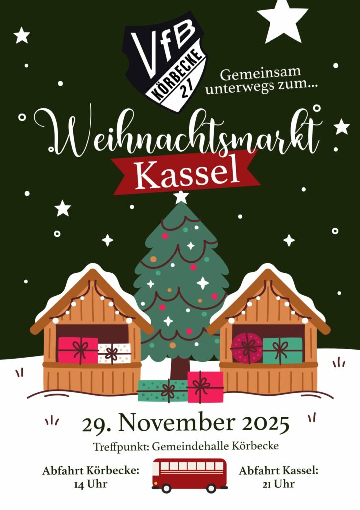 Am Samstag, den 29. November 2025, lädt der VfB 1921 Körbecke e.V. alle Mitglieder zur Weihnachtsmarktfahrt nach Kassel ein – als Dankeschön für ein gelungenes Jahr 2025! Die Busfahrt und Getränke im Bus sind kostenlos. Ihr müsst übrigens kein Mitglied sein!