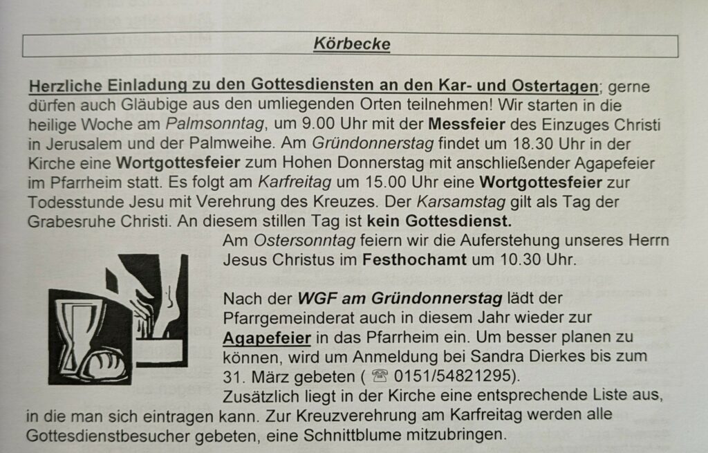 Es wird in diesem Zusammenhang besonders auf die Agapefeier am Gründonnerstag nach der Wortgottesfeier hingewiesen; Anmeldungen sind jetzt möglich bei Sandra Dierkes oder über eine Liste in der Kirche.